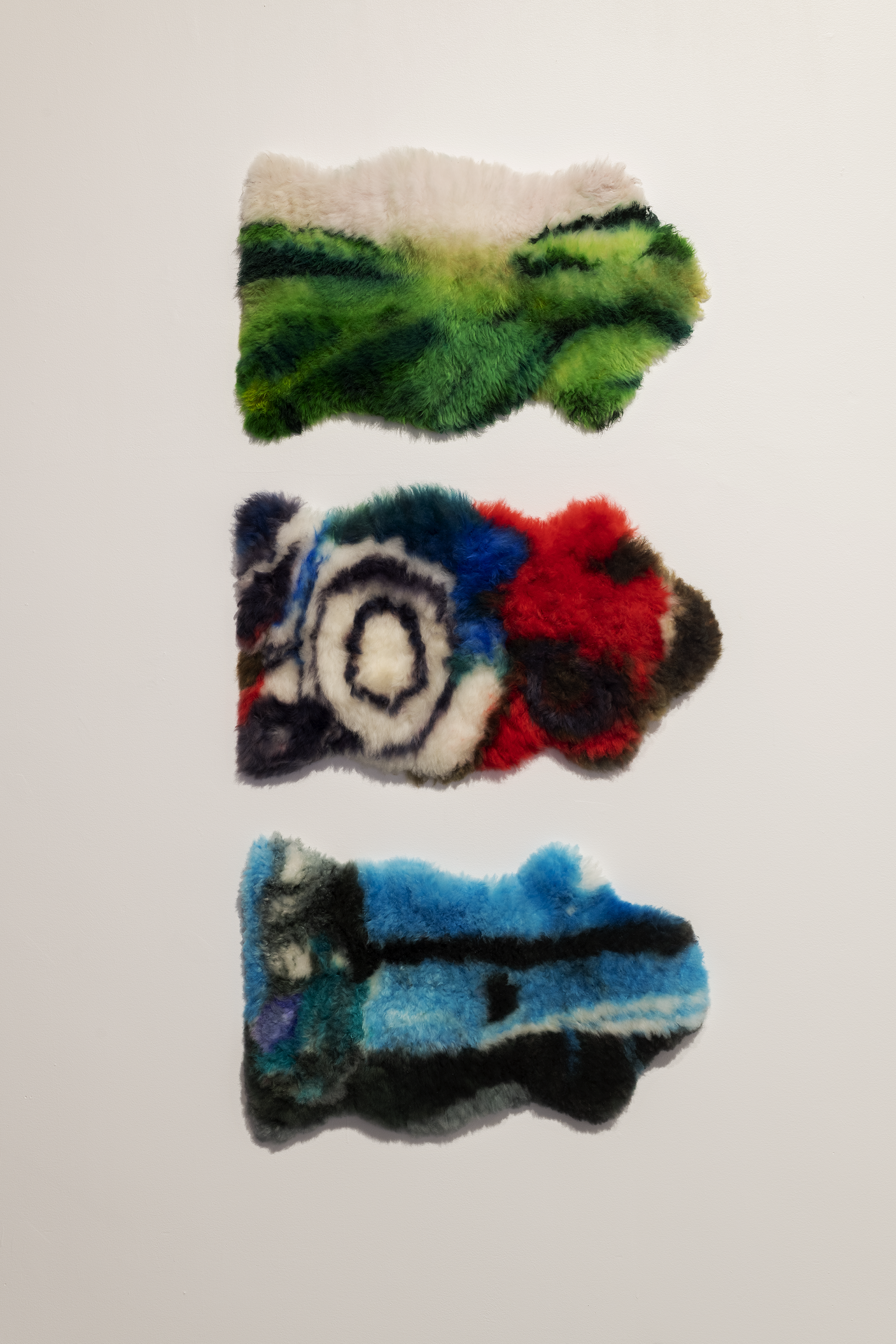 Postview (2021) is an installation combining machine generated video and a series of hair dye painted faux wools. A machine learning algorism, named StyleGan, it uses neural network to learn and find similarity from a given dataset. In this case: a dataset of over 500 images of machines in landscapes is used for training. It generates a morphing, dreaming like imagery, giving a dystopia view into the age of the high technology future.